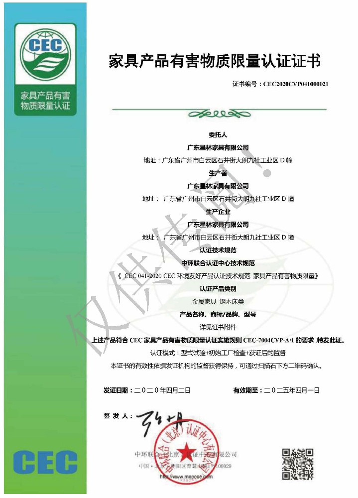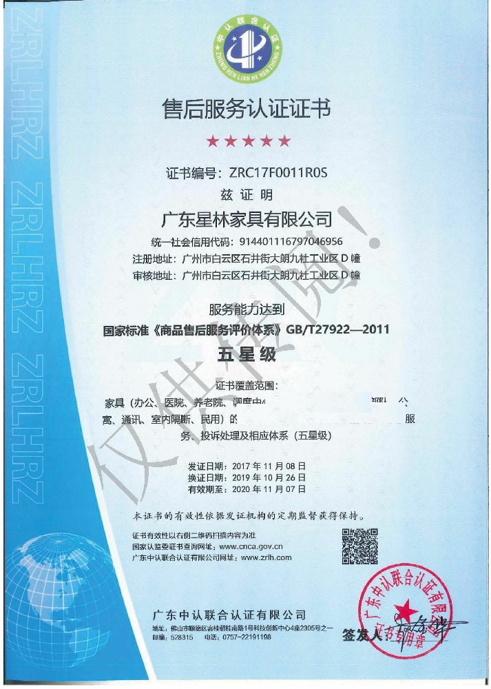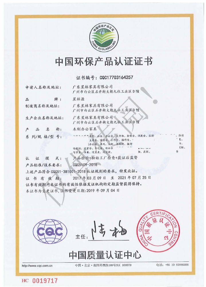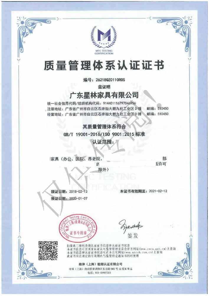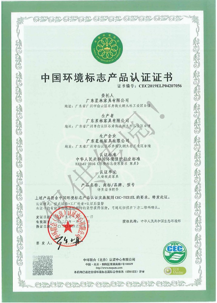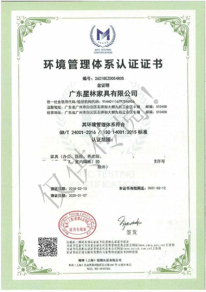 廣東星林家具有限公司創(chuàng)建于家具盛世之期,專業(yè)致力于辦公家具、醫(yī)療家具、養(yǎng)老家具的開發(fā)、設計、生產。公司率先通過ISO9001質量管理體系認證和ISO14001環(huán)境管理體系認證及職業(yè)健康安全管理體系認證,從而獲得了中環(huán)聯(lián)合(北京)認證中心有限公司頒發(fā)的“中國環(huán)境標志產品認證證書(十環(huán)認證)”等。